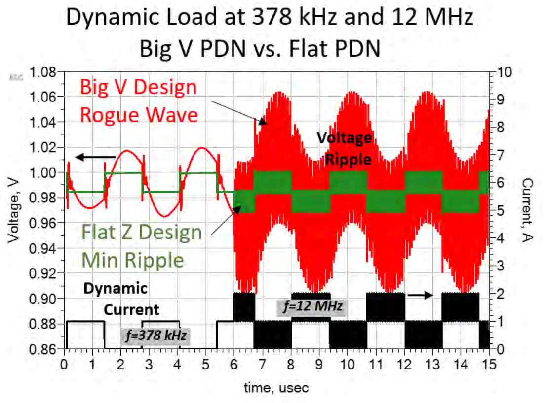或是如果有在100MHz這個區域甚至更高的頻率有超過Target impedance的反諧振點,就很有可能引發所謂Rogue Wave的大海嘯,電壓波形會開始唱世界名曲,炸裂…